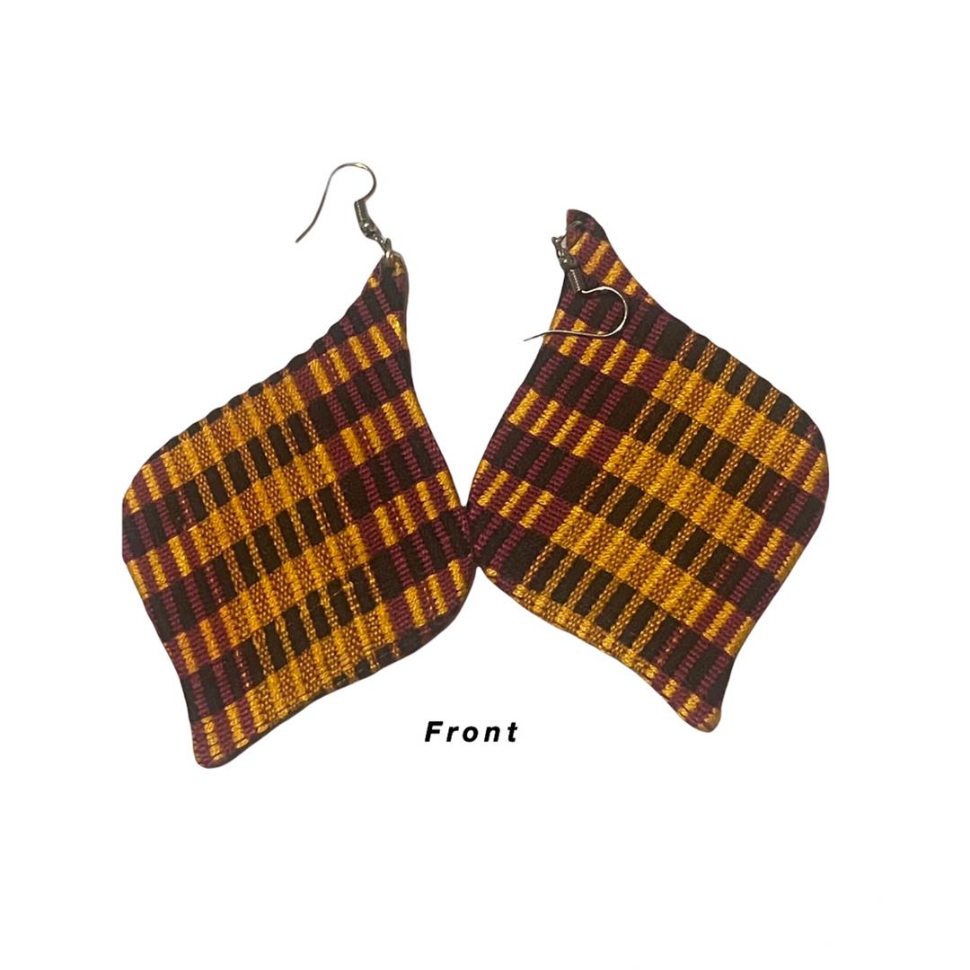 The African Style,Beautiful handmade kente cloth earrings Made in Ghana. Earrings are light weight covered with Quality Handwoven Kente cloth. Earrings shown are About 3.0” or more. unique one piece only earring lightweight for looking glam and feeling feminine