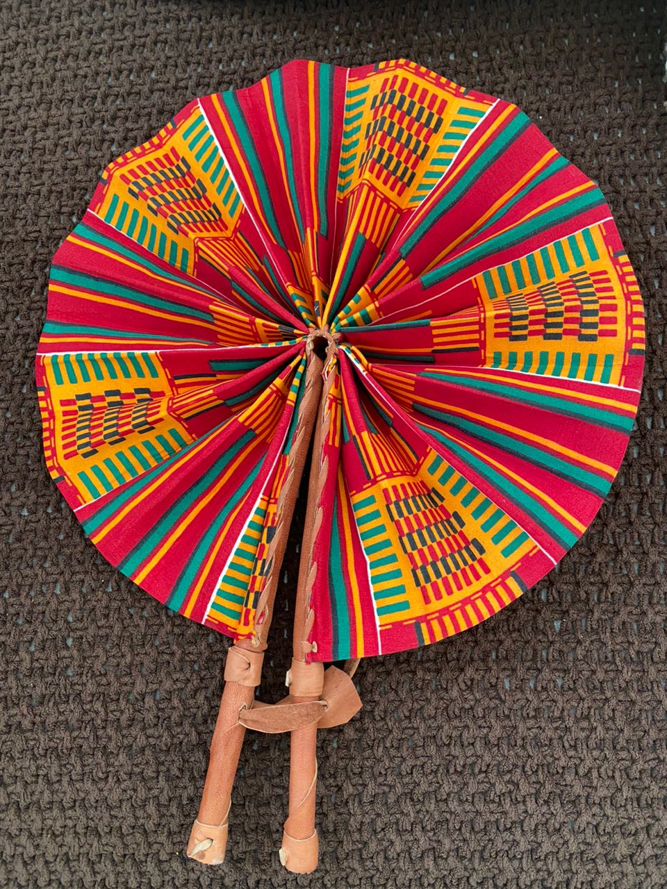 This is a Beautiful, African, hand-held fan, made from colorful Kente African fabric crafted in the genuine leather handle and finishing. Fits into your purse as it folds into approximately 12”x 2.5”. Diameter when open is approximately 12”x 15” Ideal for home decor or cooling yourself off in tropical summer weather, perfect for a gift and wedding favors. Find one for your African dress accompaniment. We take large wedding orders.
