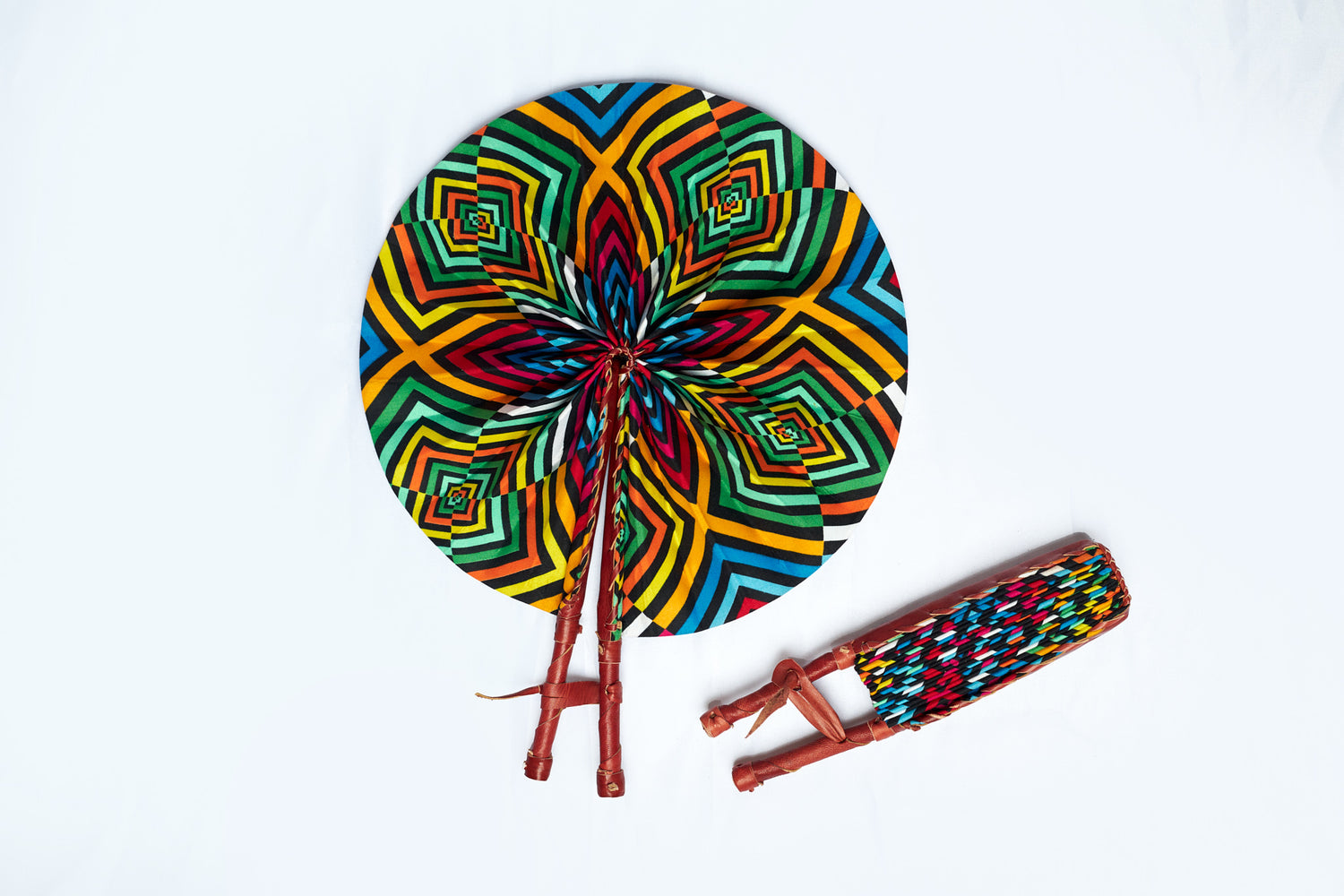 This is a Beautiful, African, hand-held fan, made from colorful Bogolan African fabric crafted in the genuine leather handle and finishing.Comes in small and large size, Fits into your purse as it folds into approximately 12”x 2.5”for the Large and 10"x2.5 for the small size. Diameter when open is approximately 12”x 15”(large),10"x 15"(small). Ideal for home decor or cooling yourself off in tropical summer weather, perfect for a gift and wedding favors. Find one for your African dress accompaniment. We take large wedding orders.
