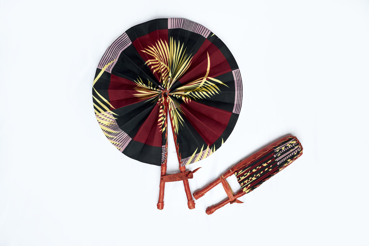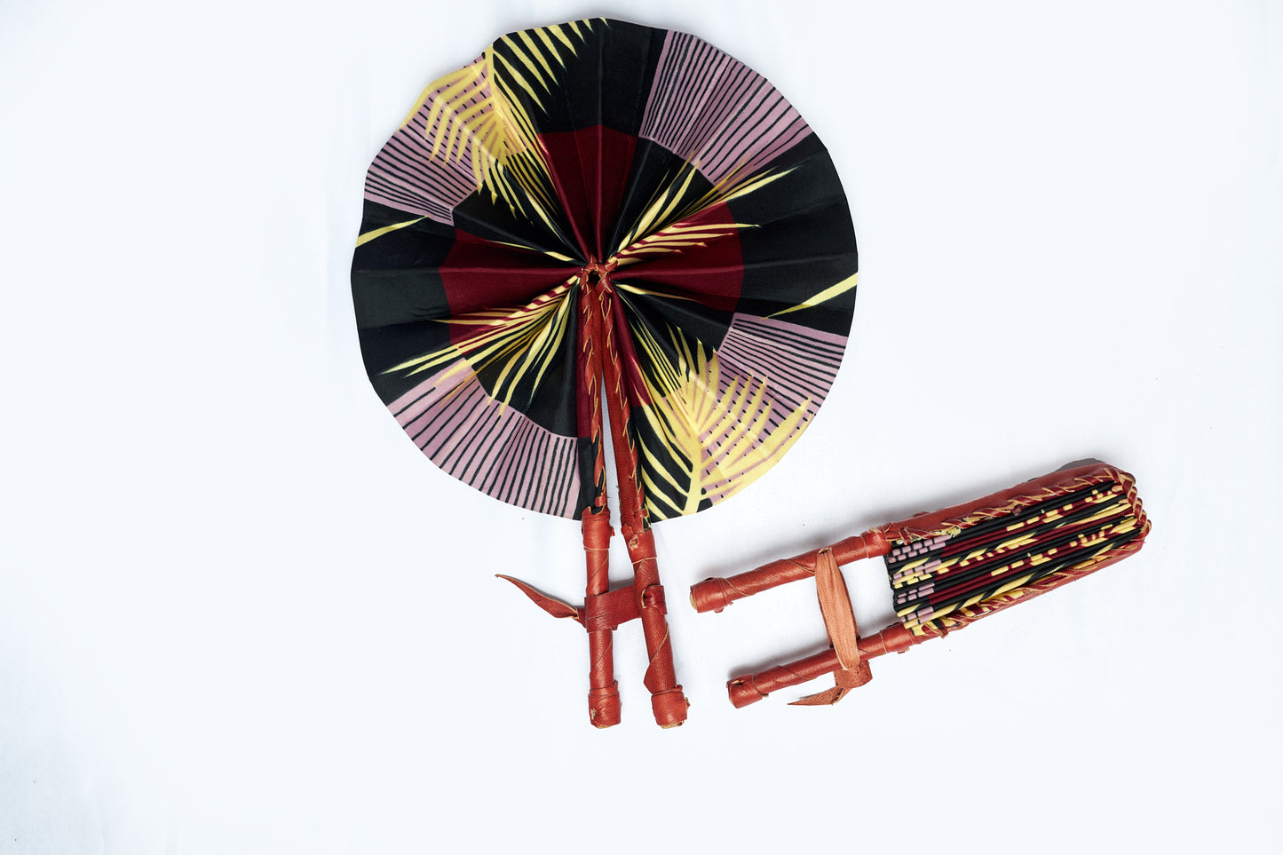 This is a Beautiful, African, hand-held fan, made from colorful Bogolan African fabric crafted in the genuine leather handle and finishing.Comes in small and large size, Fits into your purse as it folds into approximately 12”x 2.5”for the Large and 10"x2.5 for the small size. Diameter when open is approximately 12”x 15”(large),10"x 15"(small) Ideal for home decor or cooling yourself off in tropical summer weather, perfect for a gift and wedding favors. Find one for your African dress accompaniment. We take large wedding orders.