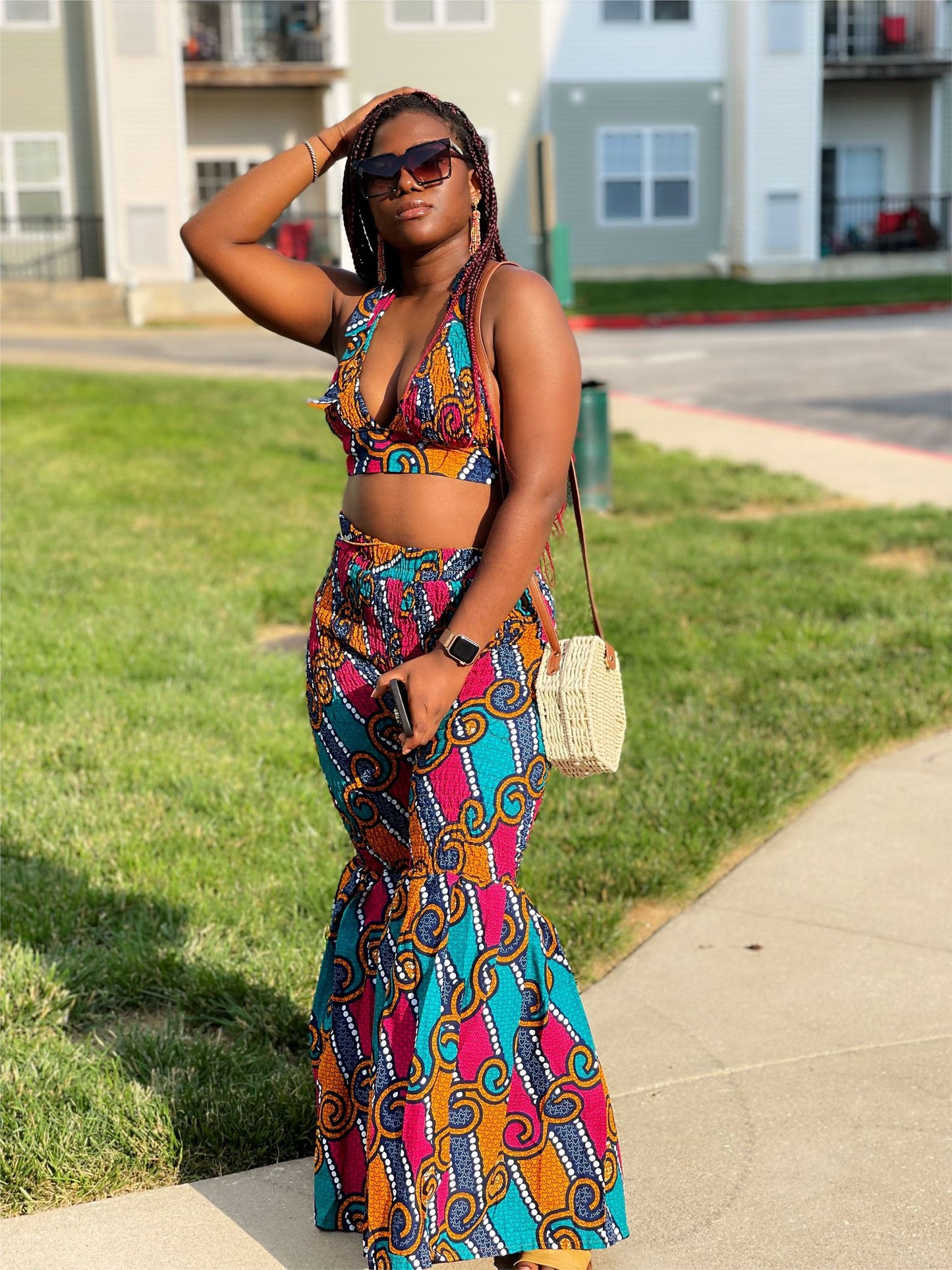 This is a set of ladies wear,made of beautiful Ankara Wax Print. It is very stretchy and comfortable to wear.