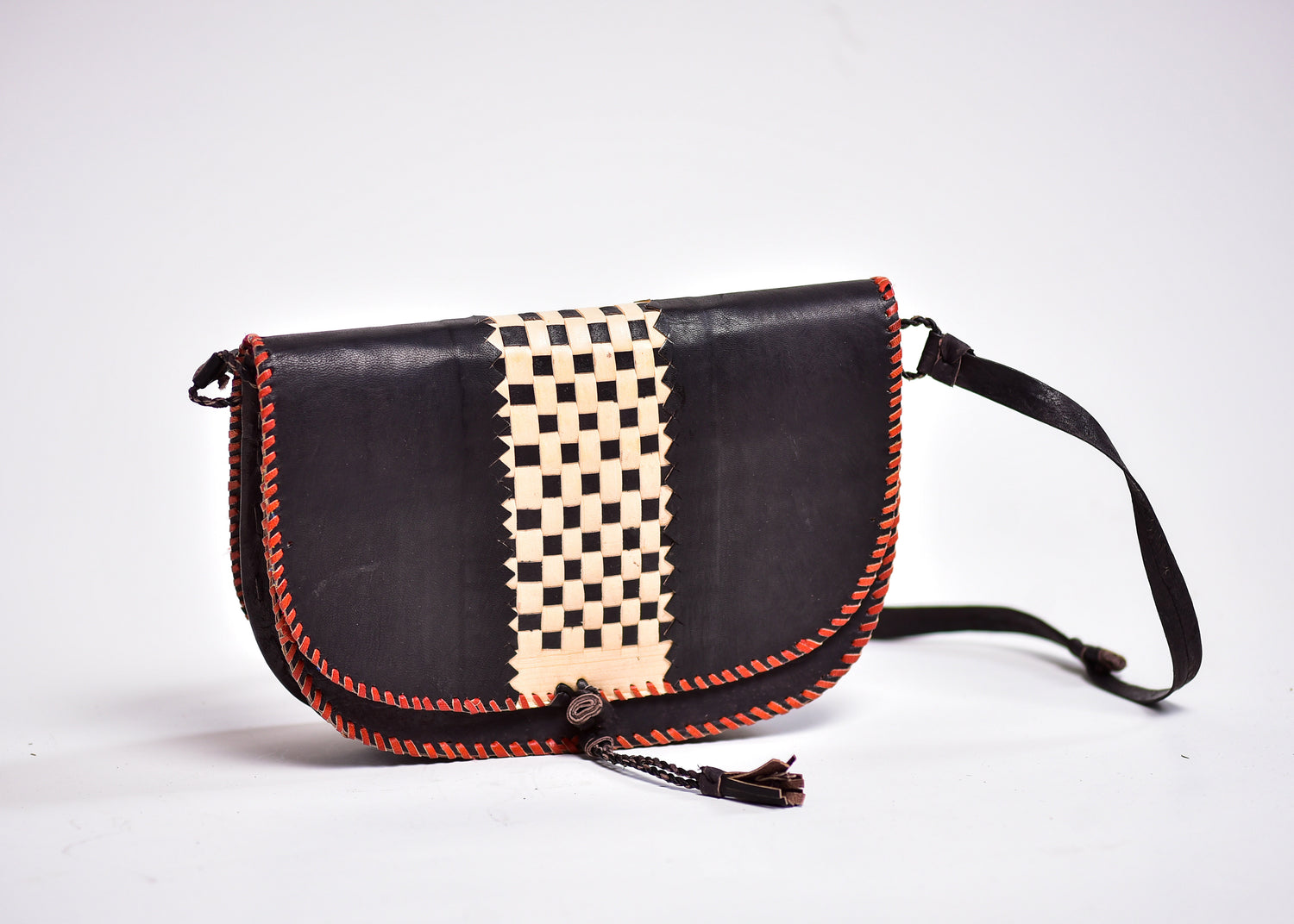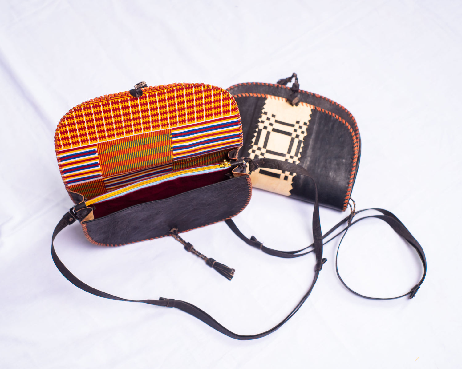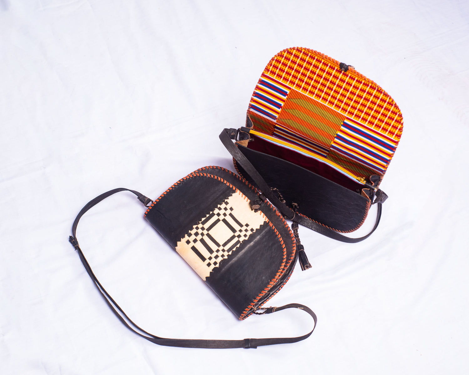 Leather Saddle bag. Handmade of pure leather,metallic ziper and has the inside/inner part beautifully designed with African print fabric . Good for a boho collection, easy outdoors trips, can make a statement in outdoor event. Perfect for a country music event/ dress code