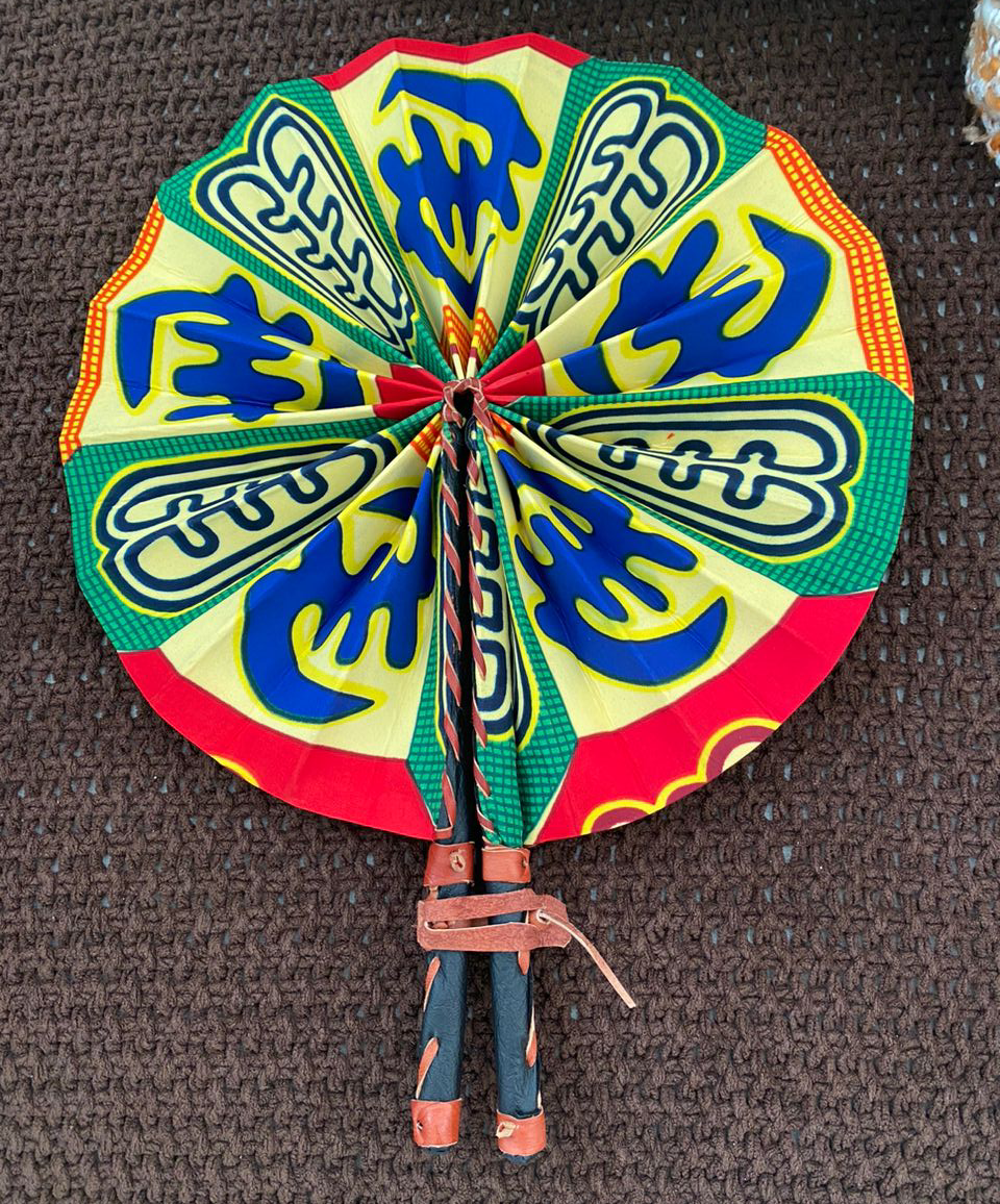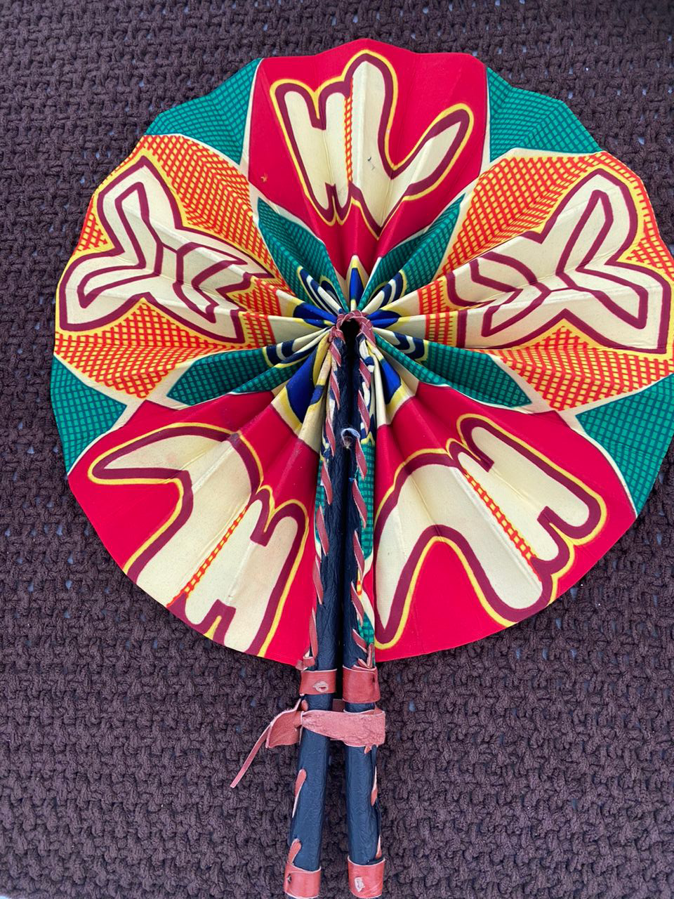 This is a Beautiful, African, hand-held fan, made from colorful Kente African fabric crafted in the genuine leather handle and finishing. Fits into your purse as it folds into approximately 12”x 2.5”. Diameter when open is approximately 12”x 15” Ideal for home decor or cooling yourself off in tropical summer weather, perfect for a gift and wedding favors. Find one for your African dress accompaniment. We take large wedding orders.