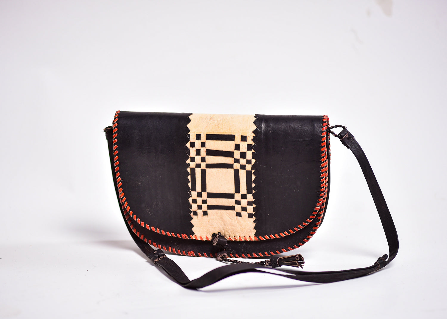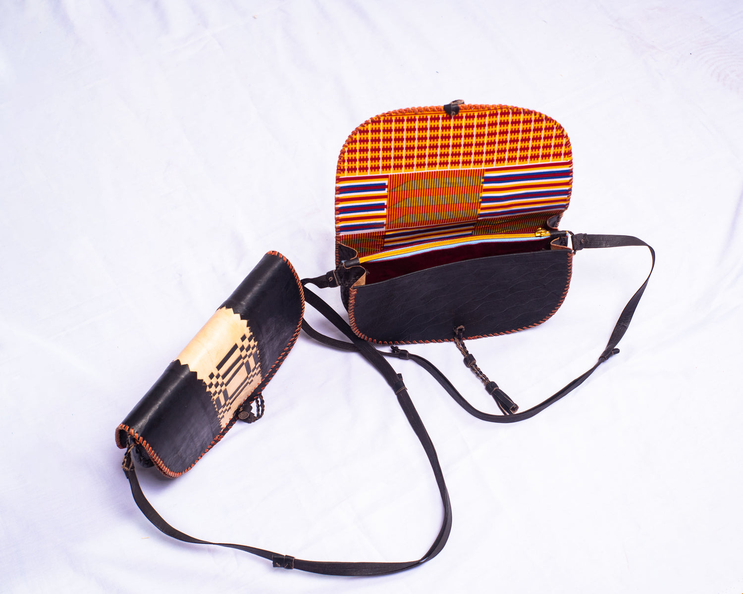 Leather Saddle bag. Handmade of pure leather,a metallic zipper and has the inside/inner part beautifully designed with African print fabric . Good for a boho collection, easy outdoors trips, can make a statement in outdoor event. Perfect for a country music event/ dress code