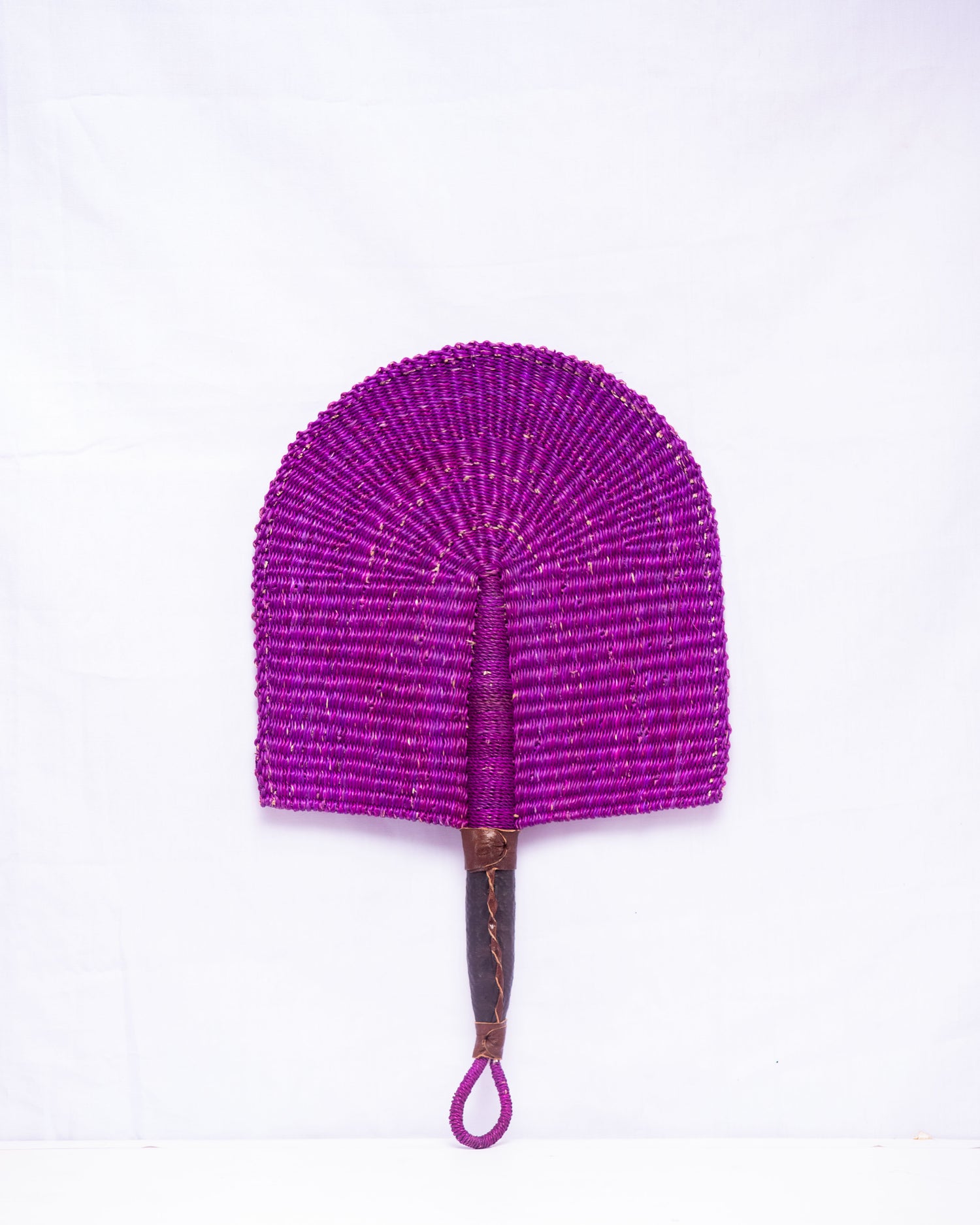 Purple is a woven handfan from the Northern part of Ghana. Made of strong but flexible straw and A LEATHER based handle that makes it easy to hold in your palm.