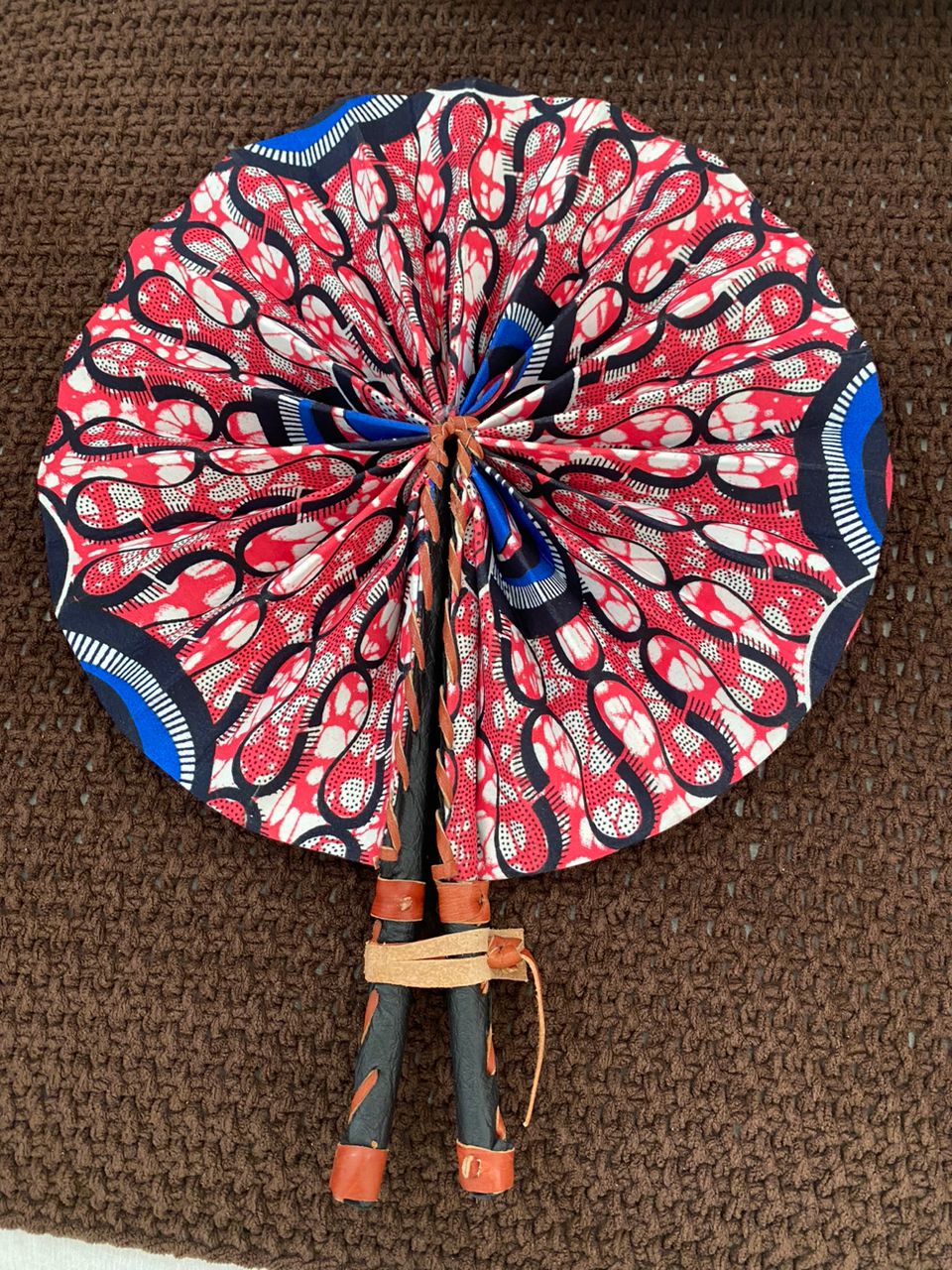 Its a Beautiful, African, hand-held fan made from colorful Ankara or African fabric crafted in the genuine leather handle and finishing. Fits into your purse as it folds into approximately 12”x 2.5”. Diameter when open is approximately 12”x 15” Ideal for home decor or cooling yourself off in tropical summer weather, perfect for a gift and wedding favors. Find one for your African dress accompaniment.