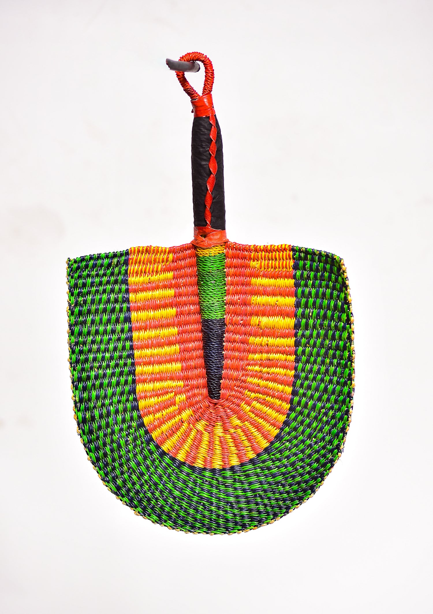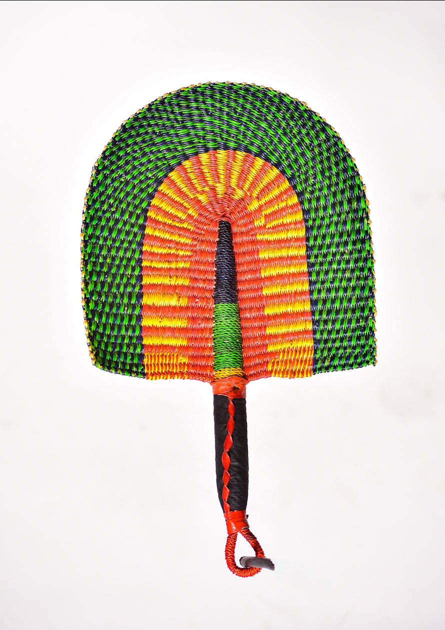 Somes is a woven handfan from the Northern part of Ghana. Made of strong but flexible straw and A LEATHER based handle that makes it easy to hold in your palm.