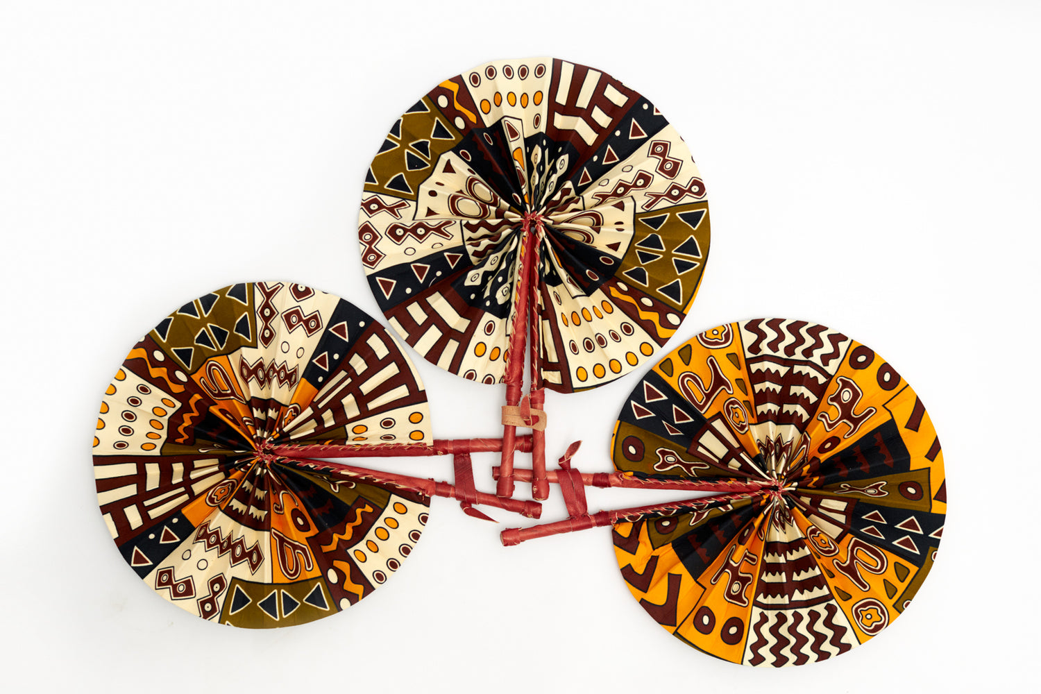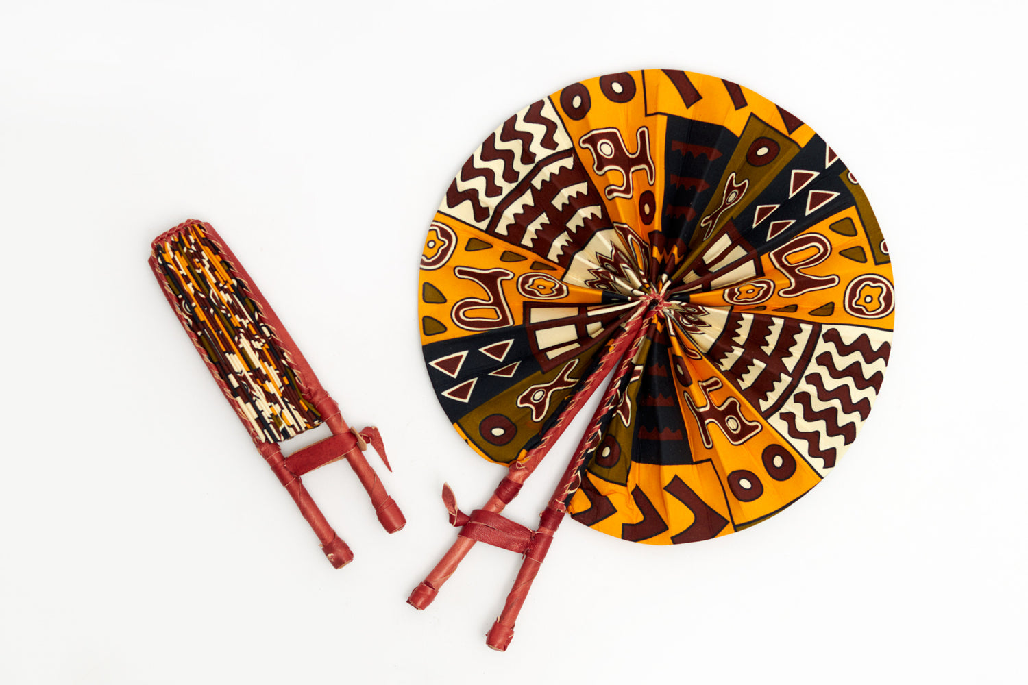 This is a Beautiful, African, hand-held fan, made from colorful Bogolan African fabric crafted in the genuine leather handle and finishing. Fits into your purse as it folds into approximately 12”x 2.5”. Diameter when open is approximately 12”x 15” Ideal for home decor or cooling yourself off in tropical summer weather, perfect for a gift and wedding favors. Find one for your African dress accompaniment. We take large wedding orders.