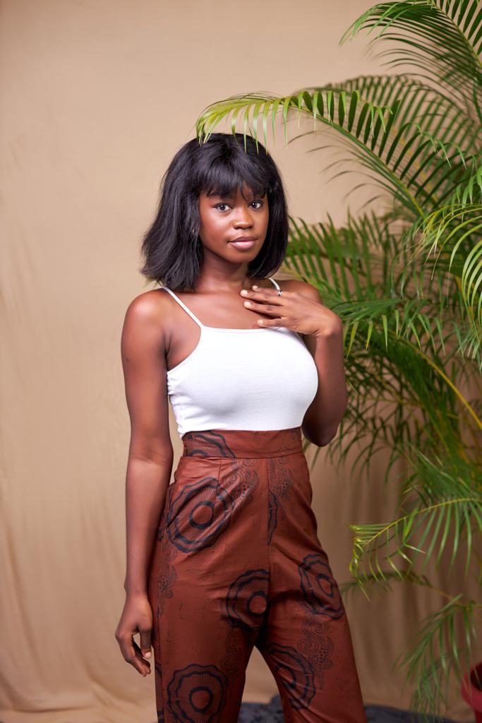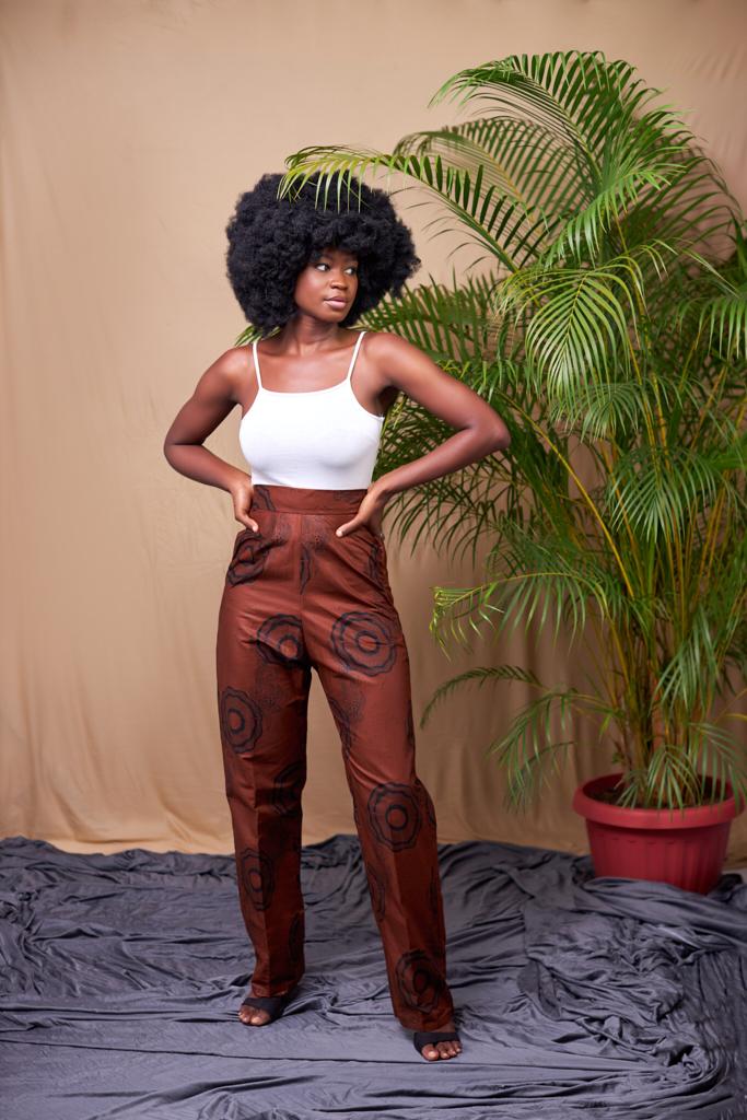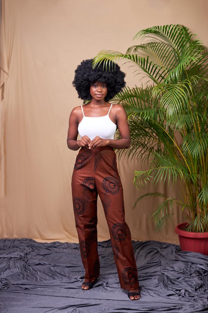 It is a high waist zipper closure and a slant pocket designed long pants. It is characterized by its flare wide leg style which is casual.
